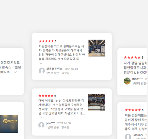 디테일링 아카데미 더 알아보기 >갓차에서 세차를 받으시고 만족하신 고객님들의 100% 리얼한 후기로 갓차 디테일링 매장의 퀄리티를 한번 더 느껴보세요!