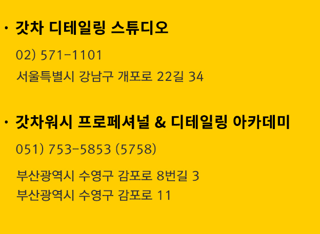 갓차는 서울과 부산에 위치한 디테일링 아카데미를 디테일러의 교육센터로 지정, 10년이상의 경력을 가진 디테일러가 직접 교육과 세차를 진행합니다.