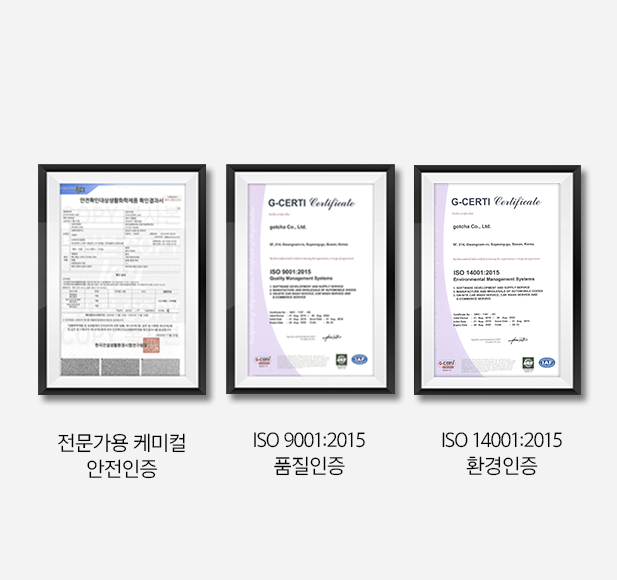 갓차는 국제적인 표준 기준 인증인 iso 품질 인증, iso 환경 인증을 받았으며, 세차 시 사용하는 케미컬 또한 안전인증을 받은 케미컬만을 사용하고 있습니다.