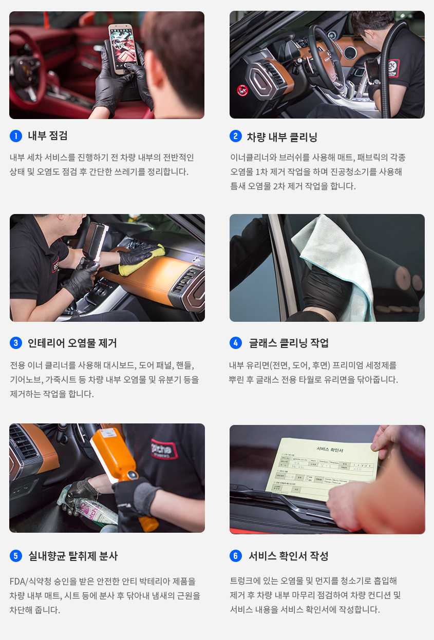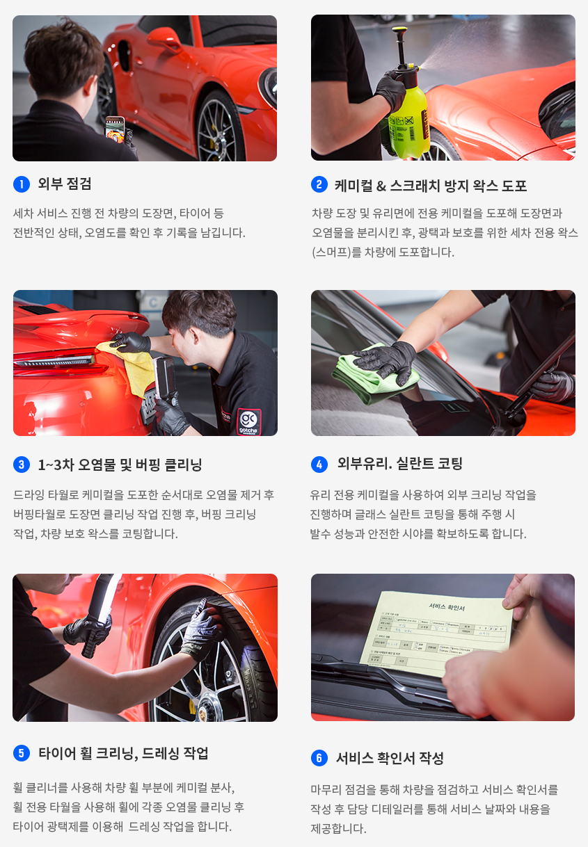 더 나은 서비스 제공을 위하여 사방이 막혀있는 지하주차장(아파트 주차장)에서만 진행이 가능하며, 차량 오염도가 높아 주차장에서 작업이 불가한경우가 있습니다.