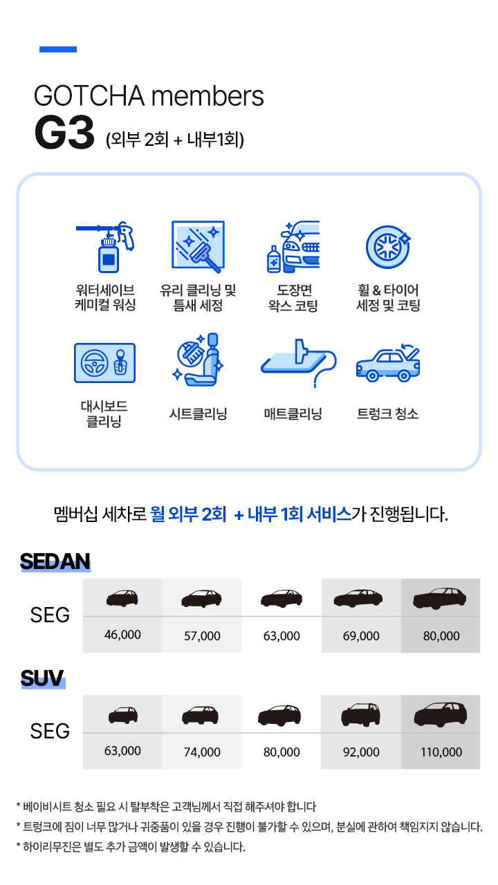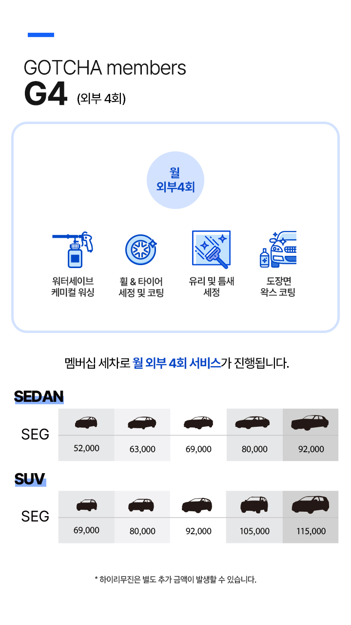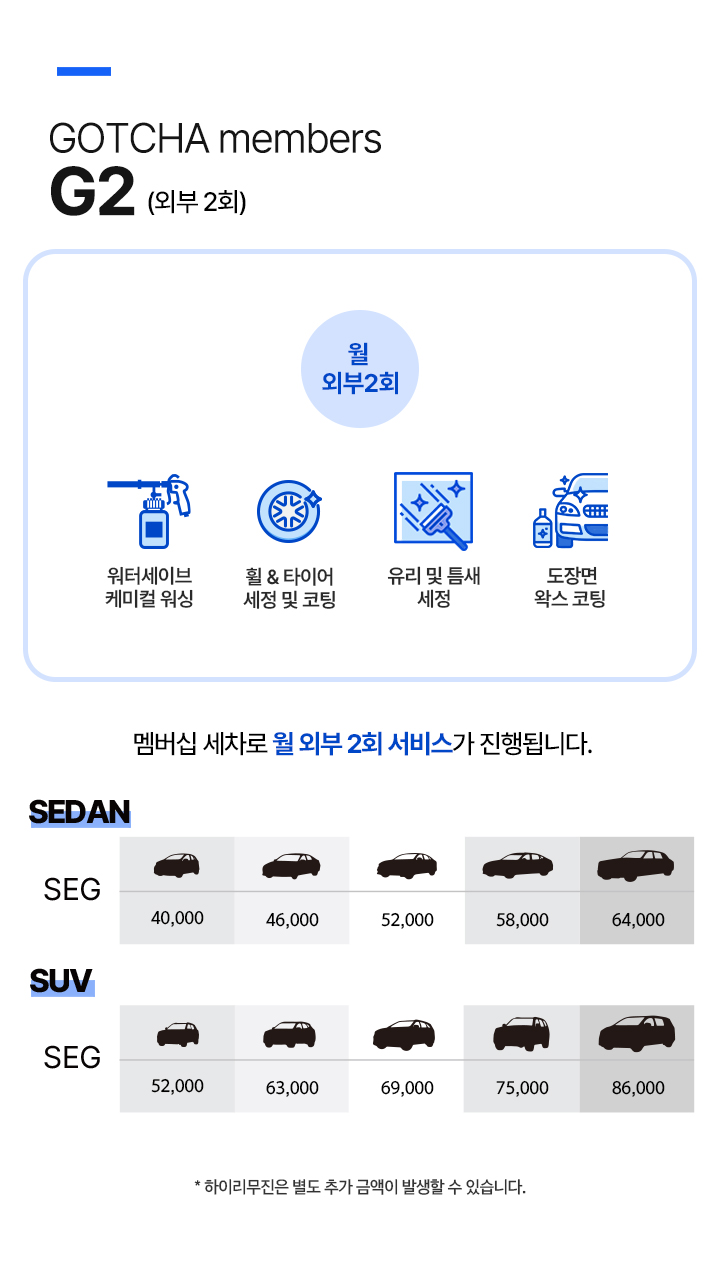 진행되는 주차장의 조건에 따라 주차비용이 발생할 경우, 세차 차량의 주차비가 청구 될 수 있습니다.